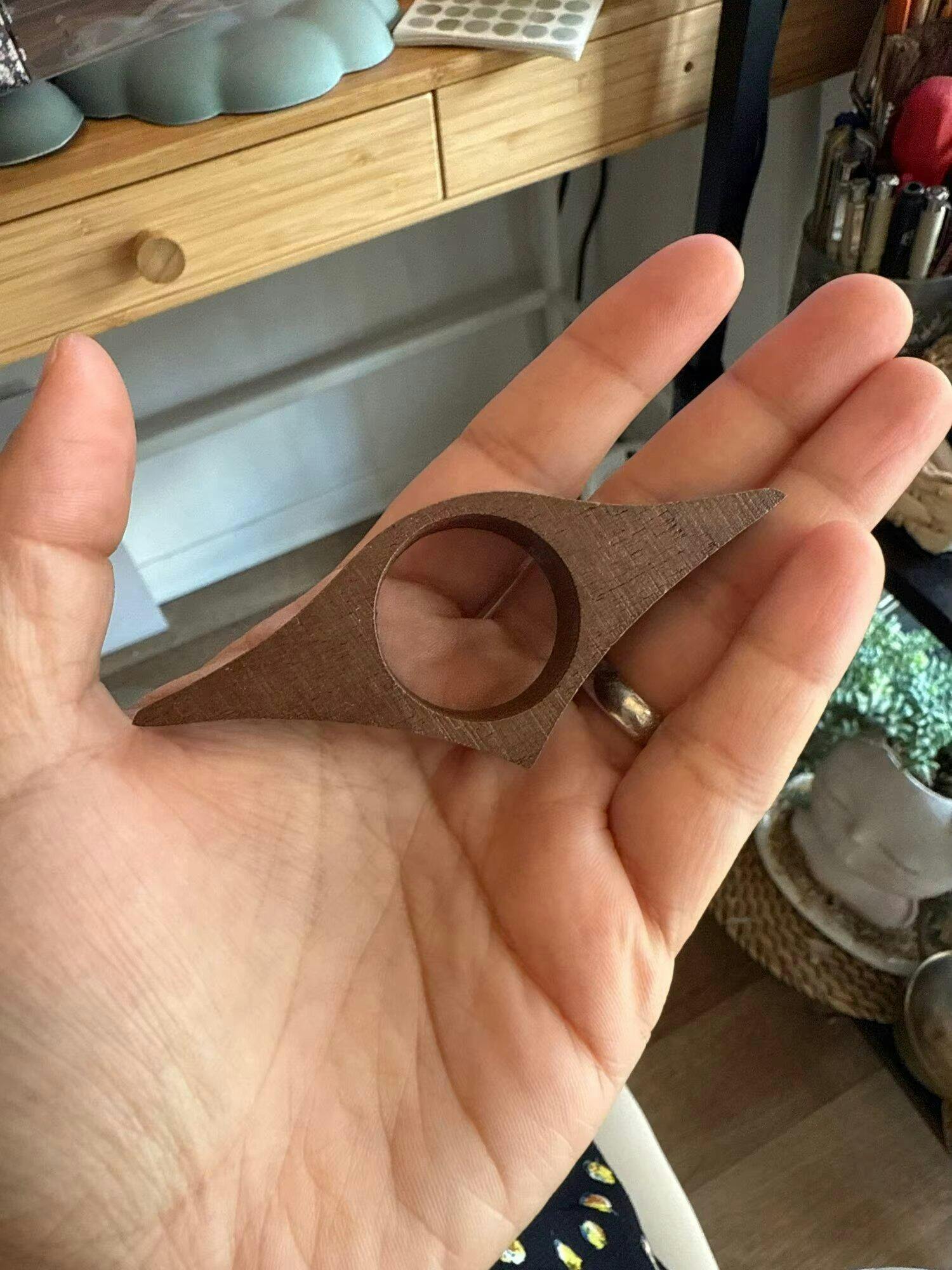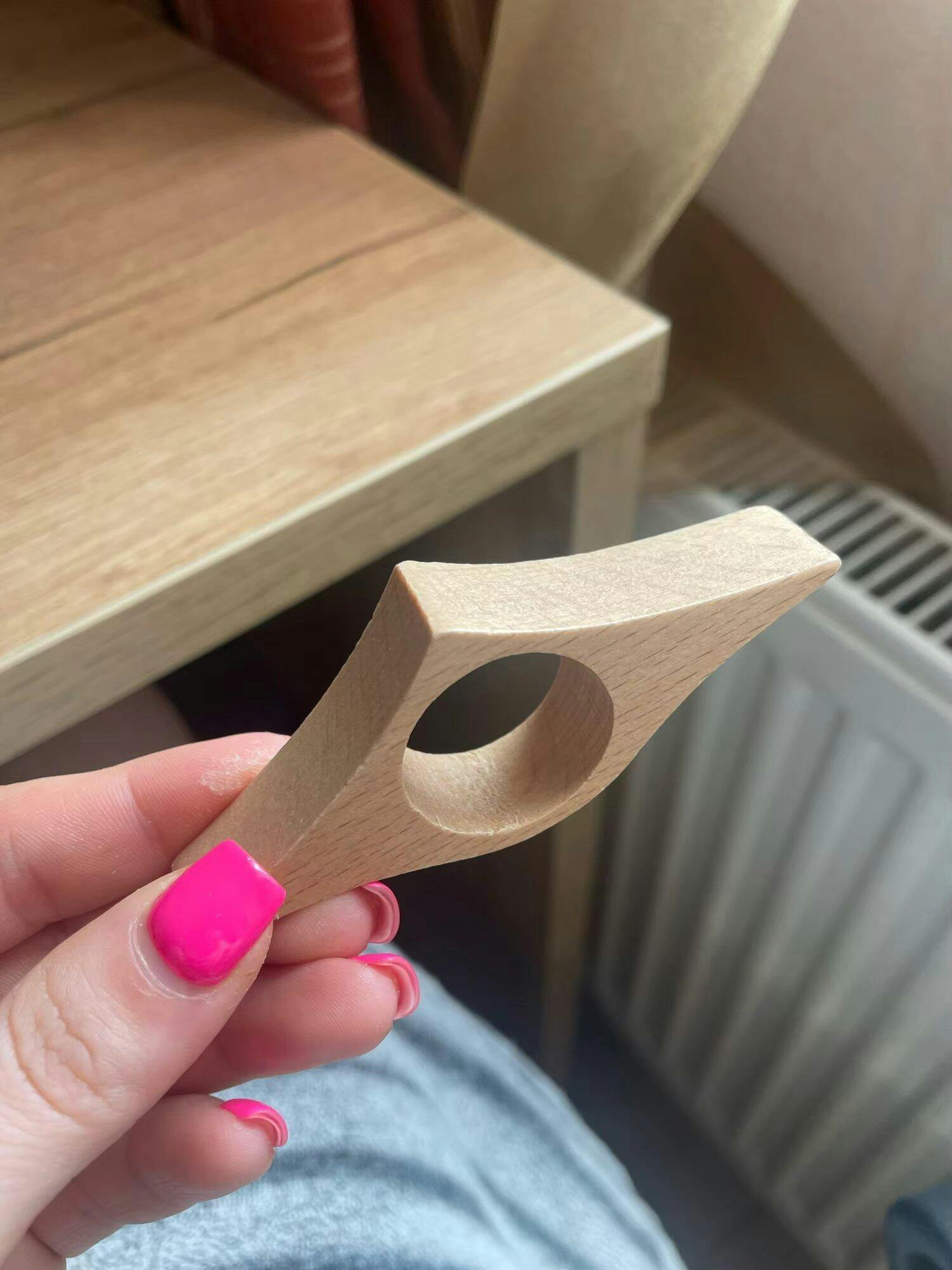 Endlich muss ich beim Lesen nicht mehr mit der Hand in jeder Seite rumfummeln. Das Daumen-Lesezeichen liegt gut in der Hand und hält die Seite zuverlässig offen. Die Holzmaserung sieht zudem schön natürlich aus.